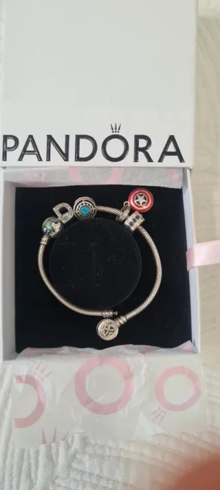 Pulsera de plata de la marca Pandora con varios charms, Superheroes Muy bien cuidada. - Charm con forma de globo terráqueo. - Charm con la letra D. - Charm con piedra turquesa, el reactor de Toni Stark, Iron Man - Charm con forma de escudo Capitan America - Charm con forma de infinito Love Forever.