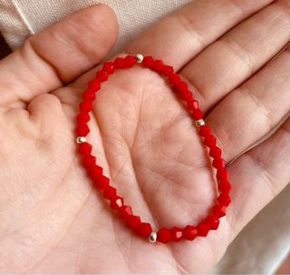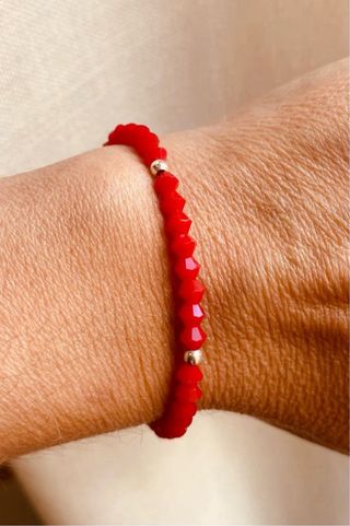 Pulsera elástica con cuentas de cristal rojo y detalles en plata. Es una talla pequeña. - Cuentas de cristal facetado. - Elementos de plata. - Diseño elástico para mayor comodidad.