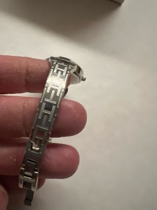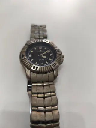 Reloj de pulsera con un diseño elegante y moderno - Correa de metal plateado - Esfera redonda de color negro. - Bisel con marcadores numéricos. - Hay que cambiar la pila