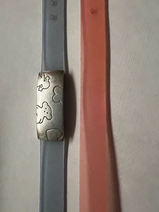 Pulsera de la marca Tous con detalles en plata y correa de silicona. - Diseño con ositos grabados - Combinación de plata y silicona rosa y azul