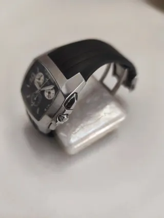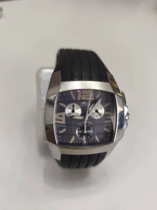 Reloj de pulsera con diseño moderno y deportivo. - Correa de caucho negra. - Caja de acero plateada. - Esfera con detalles plateados. - Hay que cambiar la pila
