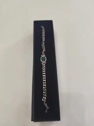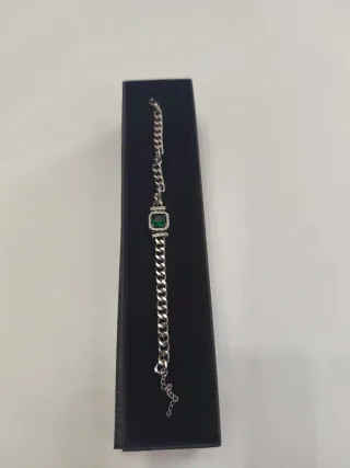 Elegante pulsera de bisutería con un diseño llamativo. Perfecta para regalos - Detalle central con pedrería verde. - Cadena plateada con eslabones. - Cierre seguro.