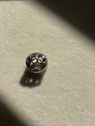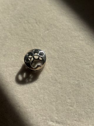 Este charm de plata tiene un diseño abierto con varias huellas. Nuevo, me lo regalaron hace unos años por un cumpleaños pero yo no tengo la pulsera. Se vende por eso, porque no tengo la pulsera y no tengo penado cómpramela. Es de plata y nunca ha sido utilizado - Diseño de huellas de animal. - Material: Plata.