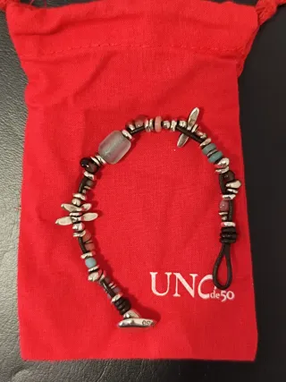 Elegante pulsera de la marca Uno de 50. (Auténticas) - Diseño con detalles en piel y plata. - Cierre de seguridad. - Estilo moderno y versátil.
