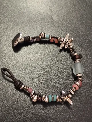 Pulsera de la marca Uno de 50 con un diseño único y original. - Elaborada con cuero y adornada con cuentas de cristal y metal. - Cierre de mosquetón seguro y práctico. - Pieza artesanal con detalles distintivos.