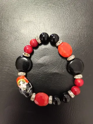 Pulsera de bisutería con cuentas de colores y detalles de gemoterapia. - Diseño único con una matrioska pintada. - Combina cuentas negras y rojas. - Adornada con pequeñas piezas plateadas.