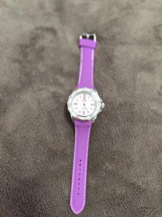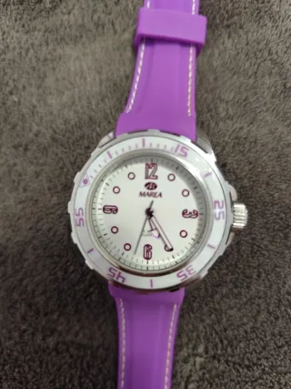 Reloj de pulsera de la marca Marea con una llamativa combinación de colores. - Correa de silicona morada. - Esfera blanca con detalles morados. - Bisel plateado.