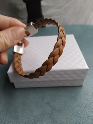 Elegante pulsera de cuero trenzado con detalles en baño de plata. Un accesorio moderno y versátil. - Diseño trenzado. - Cierre de metal plateado.
