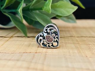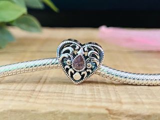 Este charm en forma de corazón con diseño de flor de loto es un accesorio delicado. - Detalle de piedra morada en forma de lágrima. - Elaborado en plata con filigranas. - Diseño calado con motivos florales.