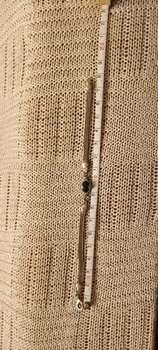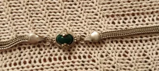 Elegante pulsera de plata con un detalle central de piedra verde. Pesa 5,6 gramos y mide 18 cm. Comprada en Marruecos hace bastantes años. En perfecto estado de conservación. - Diseño de cadena con múltiples hilos. - Cierre de seguridad. - Adorno ovalado con gema verde.