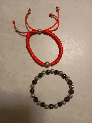 Conjunto de dos pulseras, una de cordón rojo y otra de cuentas. - Pulsera de cordón ajustable con cuentas plateadas. - Pulsera elástica con cuentas negras y plateadas.
