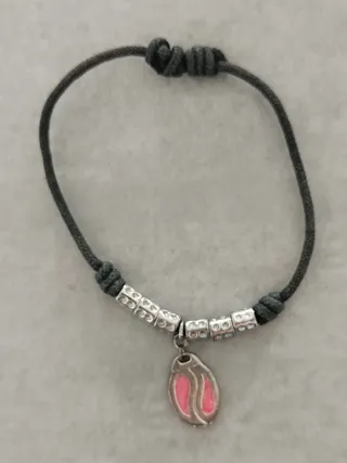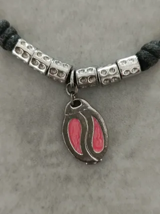 Pulsera con un cordón oscuro y detalles plateados. El colgante tiene un diseño ovalado con detalles en color rosa. - Colgante con esmalte rosa. - Cuentas metálicas con diseño. - Cordón trenzado.