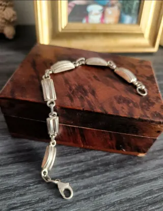 Elegante pulsera de Plata de Ley 925 con diseño únicode eslabones rectangulares acanalados de estilo vintage. Es una pieza con mucha personalidad y cuerpo, ideal tanto para llevar sola como combinada con otras joyas. Al ser maciza, tiene una caída y un peso muy agradable en la muñeca. Excelente estado vintage. Conserva su pátina original que resalta los detalles, aunque se puede abrillantar fácilmente con cuidados clásicos de joyería. Material: Plata de Ley 925 (garantizada, con sello de autenticidad visible, ver fotos). Peso: 9 gramos (es una pieza sólida, no hueca). Diseño: Eslabones geométricos con relieve, estilo