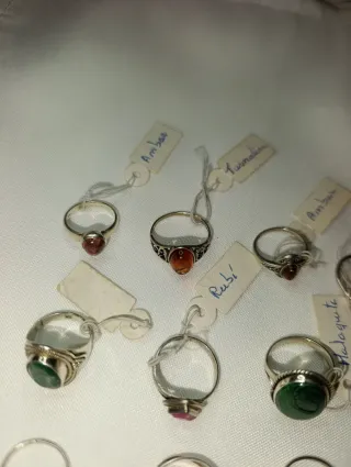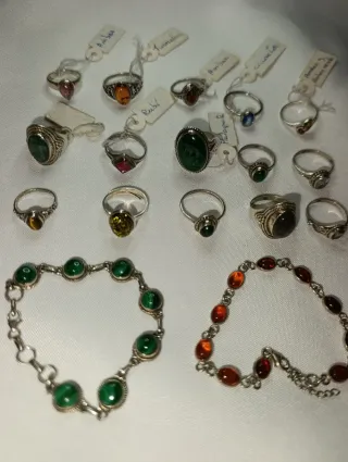 Conjunto de anillos y pulseras elaborados en plata 925. - Diseños variados con piedras semipreciosas. - Pulsera de malacita. - Pulsera de ámbar y granate.