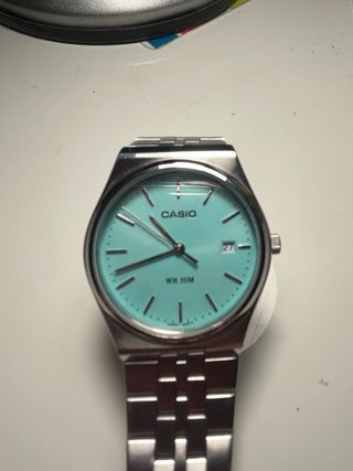 Elegante reloj Casio con una llamativa esfera de color turquesa y una pulsera de eslabones plateados. - Diseño clásico y versátil. - Resistente al agua hasta 50 metros. Tiene un pequeño arañazo en la parte inferior izquierda como se observa en las imágenes donde lo tengo puesto en la mano.
