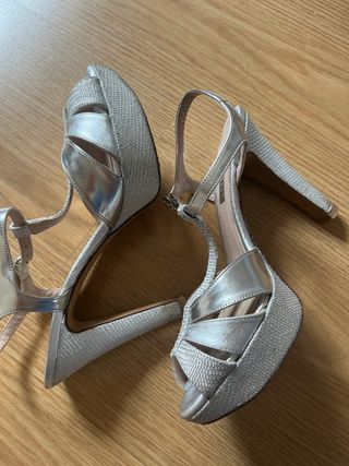 Elegantes zapatos de tacón Lodi en color plateado. Perfectos para ocasiones especiales. - Diseño con tiras cruzadas. - Plataforma delantera. - Tacón alto y fino. - Cierre de pulsera.