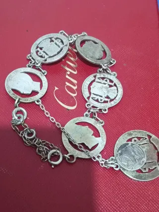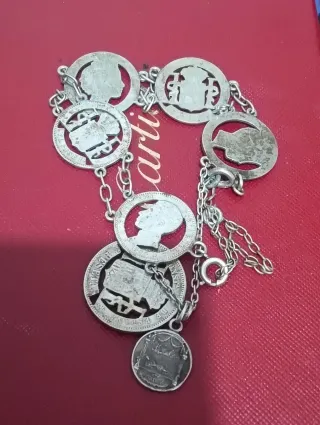 Pulsera elaborada con monedas de plata, con un diseño único y detallado. - Piezas de plata con grabados. - Cadena de plata para un ajuste cómodo. - Estilo vintage y original.