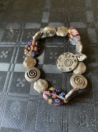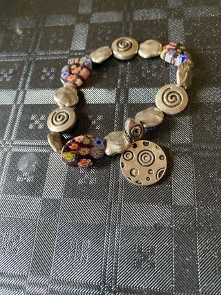 Pulsera artesanal con cristales Murano y detalles Kazuri. - Diseño único con cuentas de plata. - Cristales Murano con motivos florales. - Cuentas Kazuri con espirales y círculos.