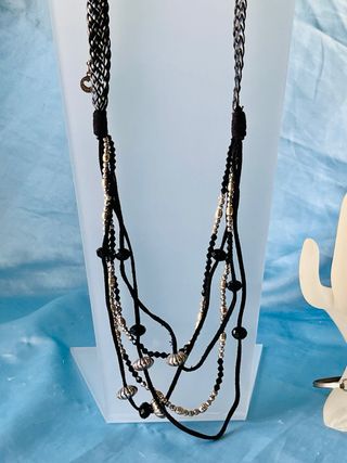 Conjunto de dos collares con un diseño elegante. - Collar largo con cuentas negras facetadas. - Collar de Lola Casademunt de varias cadenas finas con cuentas plateadas y negras. - REGALO de anillo y pulsera con piedra negra