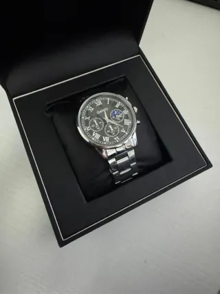 Elegante reloj de pulsera con un diseño clásico y sofisticado. - Esfera negra con detalles plateados. - Correa de eslabones plateada. - Caja de presentación incluida.