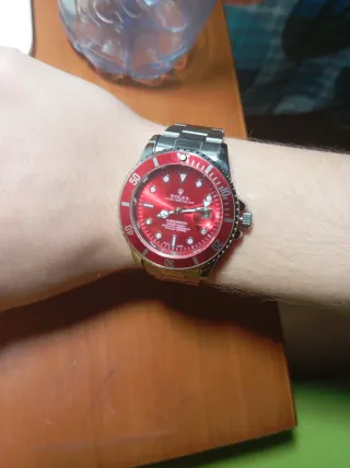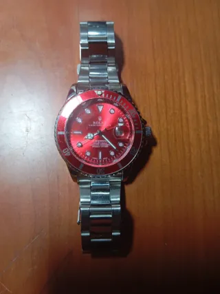 Reloj de pulsera Rolex Submariner con esfera roja y detalles plateados. - Bisel giratorio unidireccional. - Brazalete de acero inoxidable.