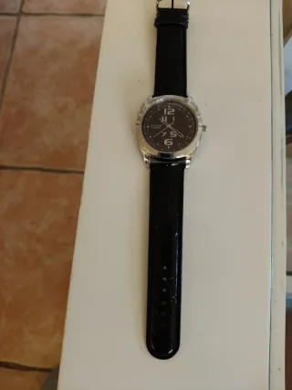Elegante reloj de pulsera con correa. Conserva su estuche - Esfera de color oscuro. - Correa de piel sintética. - Detalles metálicos plateados.