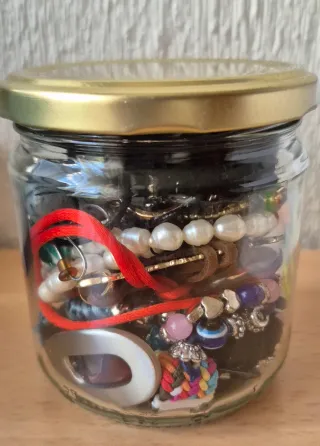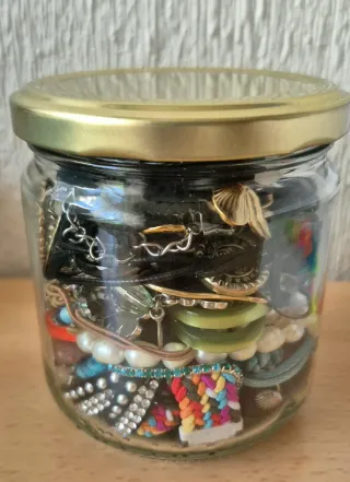 Tarro de cristal ideal para guardar bisutería y accesorios. Tiene anillos, pendientes cortos y largos, 1 reloj, pulseras, collares y colgantes. Muchos de acero inoxidable, también los hay de plata y otros de bisuteria. Todo en perfecto estado