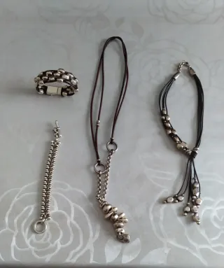 Conjunto de dos pulseras y dos collares de la marca 1para mi. - Pulsera de cuero marrón con cuentas plateadas. - Pulsera de eslabones plateados. - Collar de cuero marrón con colgante de cuentas plateadas. - Collar de cuero negro con cuentas plateadas.