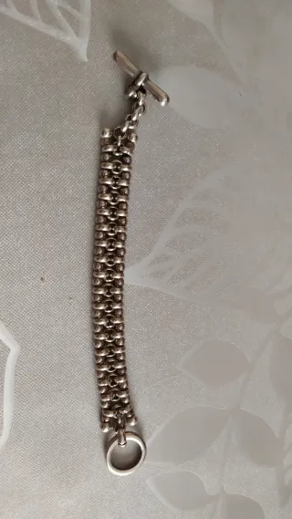Elegante pulsera de la marca Tous. - Diseño de eslabones. - Detalles en color plata. Ha sido usada únicamente en dos ocasiones. La pulsera está como nueva. *La caja tiene algún desperfecto del tiempo.
