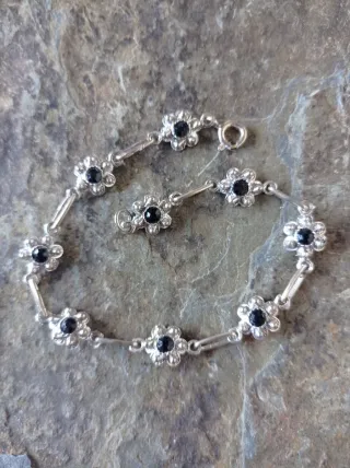Elegante pulsera de estilo vintage en plata de ley, con un diseño de filigrana y detalles de flores. Largo 18 Ctm Diámetro de roseta 8mm - Adornada con piedras negras. - Acabado en tono plateado. Artículo nuevo. no negociable