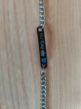 Pulsera con un diseño elegante y moderno. - Placa central con inscripción Her King. - Detalle de gema azul. - Cadena de eslabones plateada.