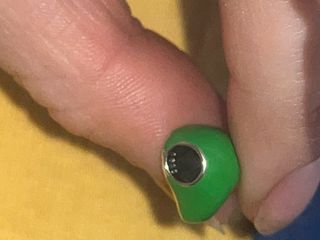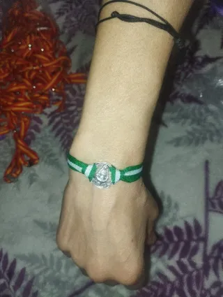 Pulsera artesanal con un diseño único. - Cinta con rayas verdes y blancas. - Detalle central plateado con relieve.