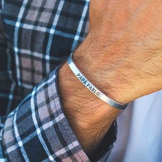 Pulsera de plata o dorada grabada con el nombre del Papá y una canción, Un detalle especial y significativo. - Diseño abierto y ajustable. - Acabado pulido. - va en una cajita.