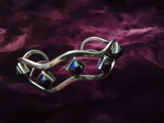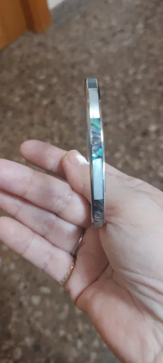 Elegante pulsera plateada con incrustaciones nacaradas. - Diámetro aproximado: 7 cm. - Diseño con incrustaciones.