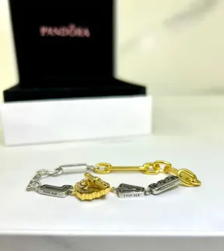 Pulsera de eslabones de Pandora, con un diseño inspirado en Keith Haring y el amor. - Combina eslabones plateados y dorados. - Cierre de tipo toggle. - Detalle central con motivo de corazón. - Grabado S925 ALE en algunas piezas.