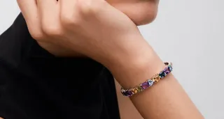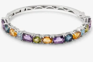 Elegante pulsera de la marca Suárez, modelo 1943. Una pieza única que combina varios colores. - Diseño con piedras de diferentes tonalidades. - Montura metálica plateada.