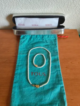 Conjunto original de TOUS compuesto por collar y pulsera a juego. Está en perfecto estado, prácticamente como nuevo. Características principales: Material: Oro amarillo de 18 quilates (750/1000). Piedras: Perlas naturales cultivadas de excelente brillo y forma regular. Diseño: El icónico oso de Tous en oro preside ambas piezas. Estado: Como nuevo, muy poco uso. Sin marcas de desgaste. Se entrega con su estuche rígido plateado original, papel de seda de la marca (tal cual se ve en las fotos). Es un conjunto atemporal, elegante y muy femenino.