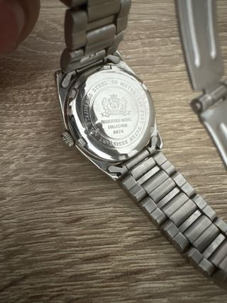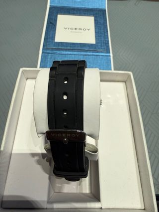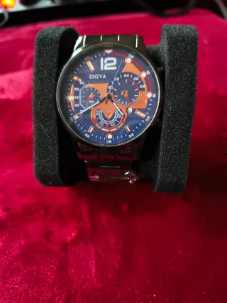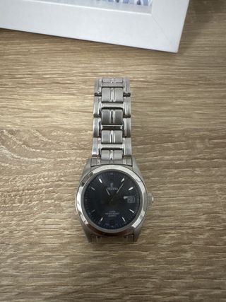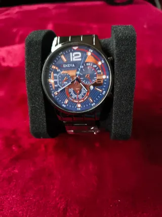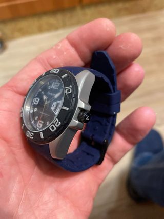 Reloj de pulsera con diseño deportivo y moderno. - Correa de silicona azul. - Caja de acero inoxidable plateada. - Esfera azul con detalles plateados. - Resistente al agua 10 ATM. - Indicador de fecha. Nuevo, nunca usado.