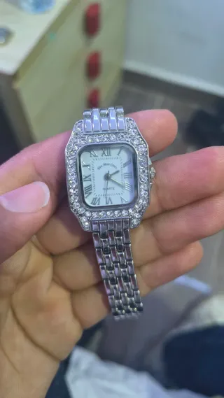 Elegante reloj de pulsera con un diseño llamativo. - Bisel adornado con cristales brillantes. - Esfera con números romanos. - Correa de eslabones metálicos.
