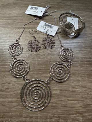 Elegante conjunto de joyas de la marca Vestopazzo, con un diseño en espiral. - Collar con varios colgantes en espiral. - Pendientes a juego con diseño en espiral. - Pulsera a juego con diseño en espiral.