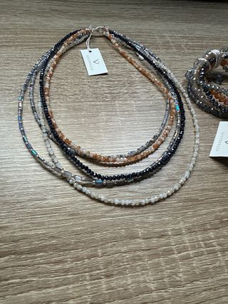 Elegante conjunto de joyas de la marca Vestopazzo. - Varias capas de collares finos con cuentas. - Pulsera a juego con múltiples hilos de cuentas. - Cierres metálicos plateados.