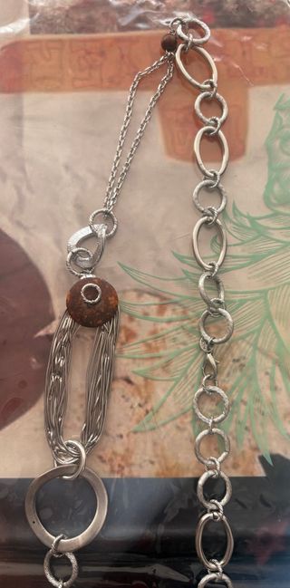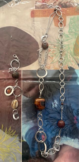 Conjunto de collar y pulsera con un diseño único. - Collar con cadena de eslabones y detalles de cuentas. - Pulsera a juego con colgantes. - Combinación de tonos plateados y marrones.