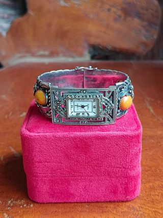 Reloj pulsera vintage de plata con ámbar natural y marcasitas (funciona) Reloj pulsera vintage de estilo clásico, tipo brazalete, con cabujones de ámbar natural en los laterales y decoración de marcasitas en la parte frontal. De plata. Movimiento quartz, funciona correctamente.