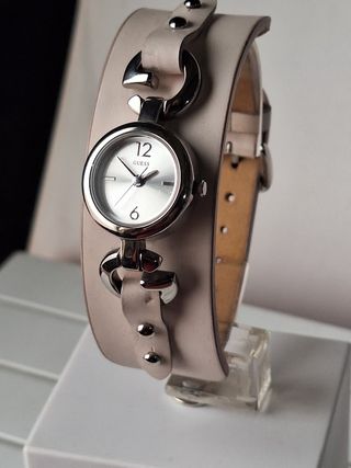 Elegante reloj de pulsera Guess para mujer. - Correa ancha de cuero beige. - Detalles metálicos plateados. - Esfera redonda plateada. Nuevo, a estrenar