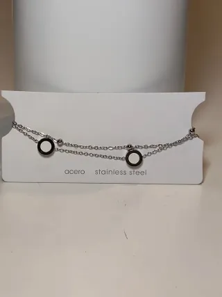 Elegante pulsera de acero quirúrgico con doble cadena y detalles circulares. - Diseño moderno con círculos en blanco y negro. - Acabado plateado brillante. - Material: Acero inoxidable.