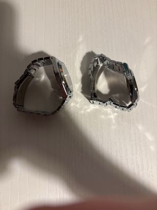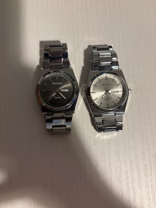 Pareja de relojes de pulsera de la marca IRLANDY. Cono nuevos, un uso. Funciona a la perfeccion con calendario doble (numerico y dia semanal) Se envia con eslabones de recambio - Diseño elegante en color plata. - Esfera en color negro.