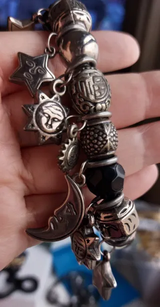 Pulsera con varios dijes plateados, incluyendo un sol con rostro, una luna creciente con rostro, estrellas y cuentas negras. - Dijes plateados con diseños detallados. - Cuentas de piedra negra facetada. - Cierre de mosquetón.