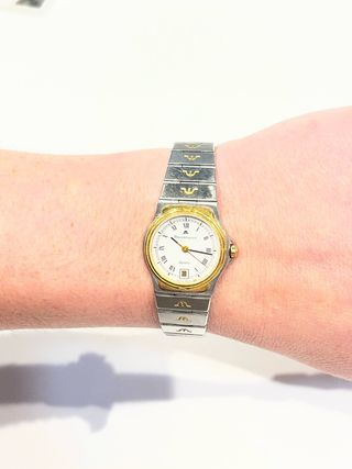 Elegante reloj de pulsera Maurice Lacroix con detalles en oro y plata. - Diseño clásico y atemporal. - Combinación de colores oro y plata.