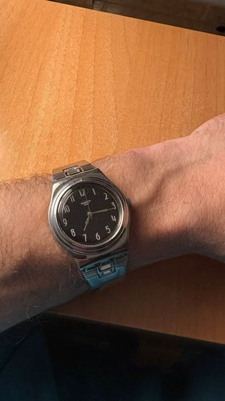 Reloj de pulsera para mujer de la marca Swatch. - Esfera negra. - Correa plateada. - Diseño clásico y elegante.