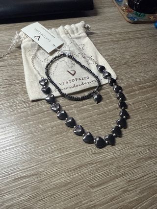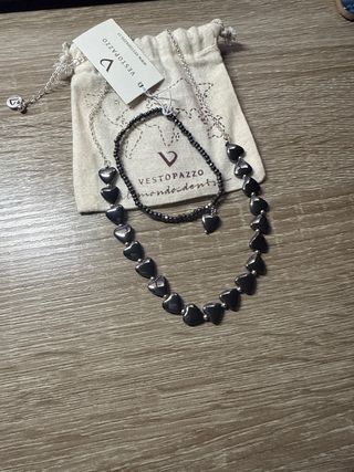 Precioso conjunto de joyas de la marca Vestopazzo. - Collar con colgantes en forma de corazón. - Pulsera a juego con pequeños corazones. - Detalles en plata.